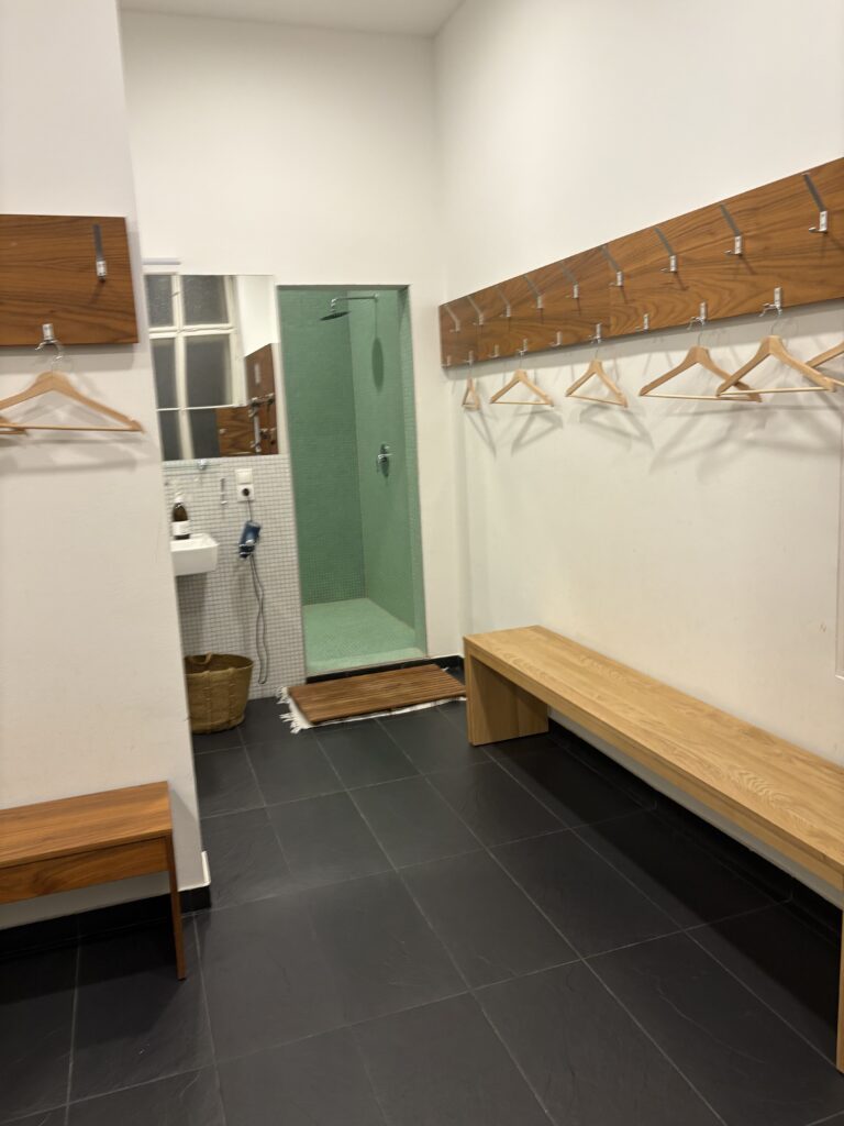 更衣室は広め。ロッカーがないけど、荷物はスタジオの中に持っていって置いておくことが可能。